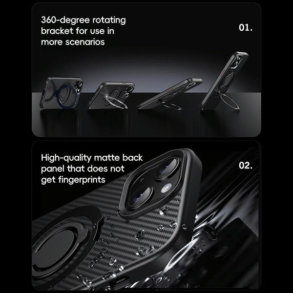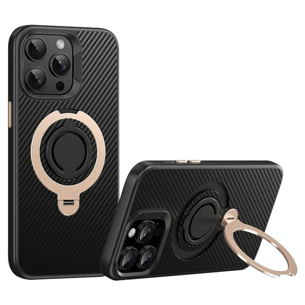 For iPhone 12 Pro Max Carbon Fiber MagSafe Phone Case with 360 Degree Rotating Holder(Black Gold)