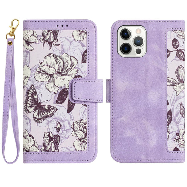 For iPhone 12 Pro Max Floral Pattern Leather Phone Case with Lanyard(Light Purple)