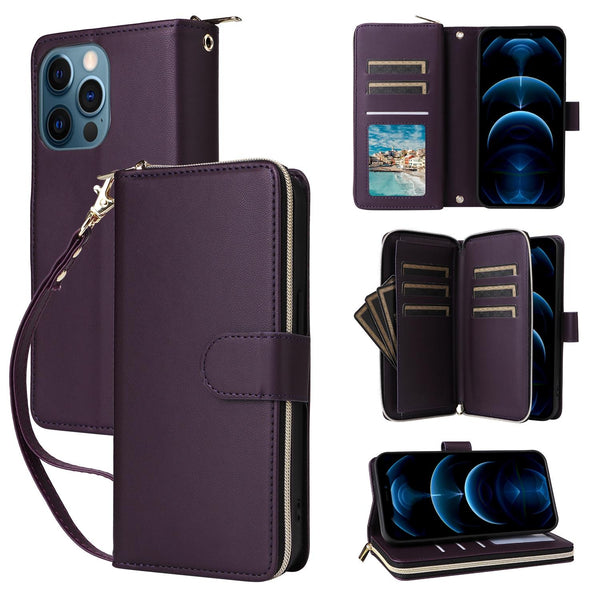 For iPhone 12 Pro Max Nine-card Slots Zipper Wallet Bag Leather Phone Case(Dark Purple)