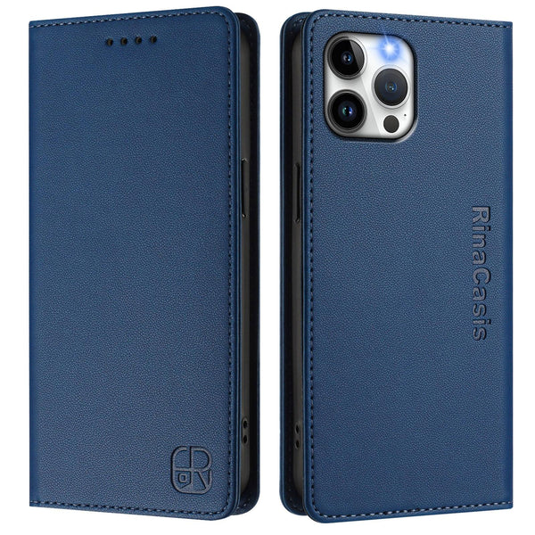 For iPhone 12 Pro Max RC01 Dual-Folded Magnetic Suction RFID Leather Phone Case(Dark Blue)