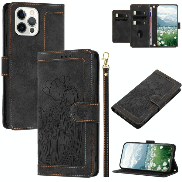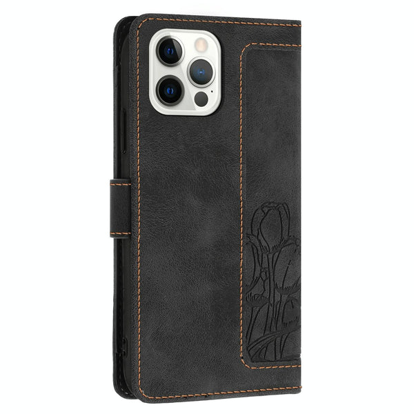 For iPhone 12 Pro Max Tulips Embossed Leather Phone Case with Lanyard(Black)