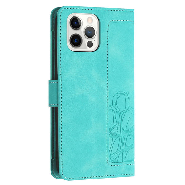 For iPhone 12 Pro Max Tulips Embossed Leather Phone Case with Lanyard(Green)