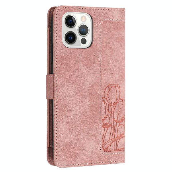 For iPhone 12 Pro Max Tulips Embossed Leather Phone Case with Lanyard(Pink)