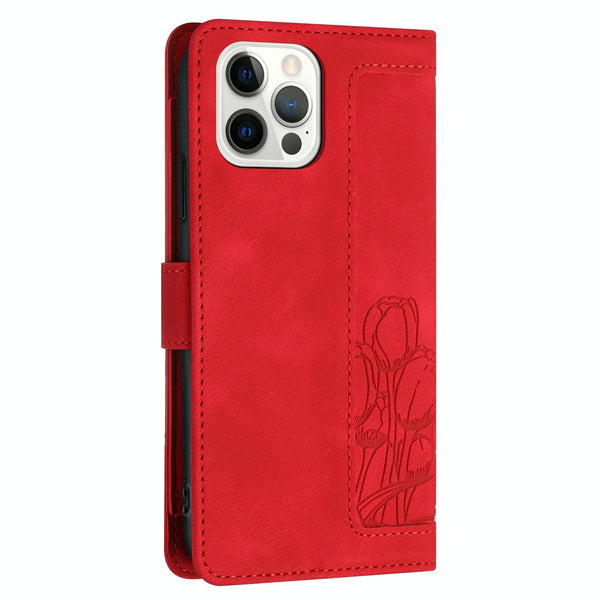 For iPhone 12 Pro Max Tulips Embossed Leather Phone Case with Lanyard(Red)