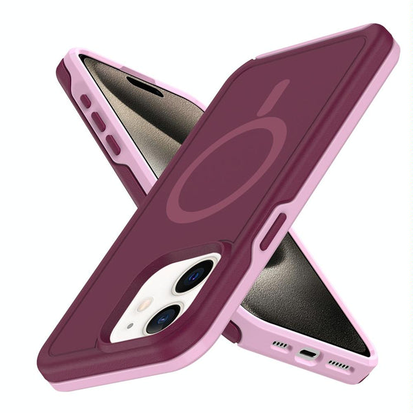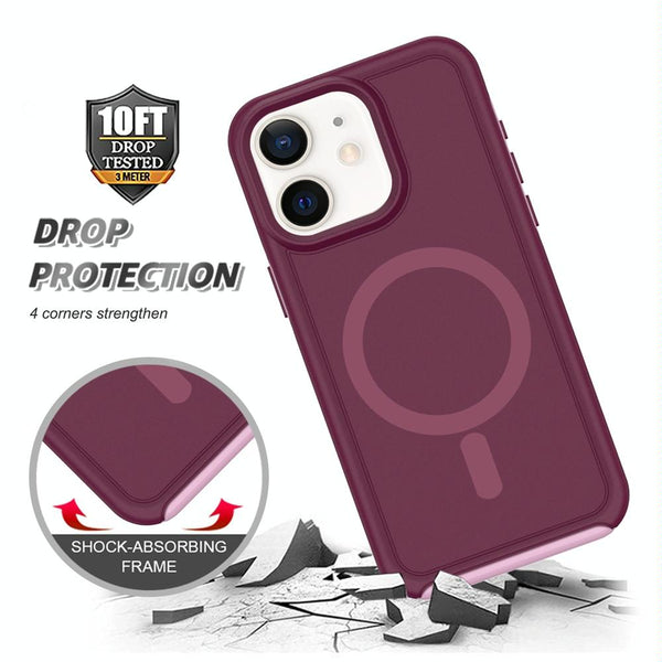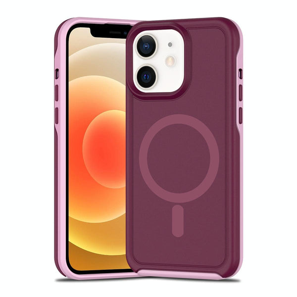 For iPhone 12 Shockproof MagSafe Armor PC Hybrid TPU Phone Case(Wine Red+Light Pink)