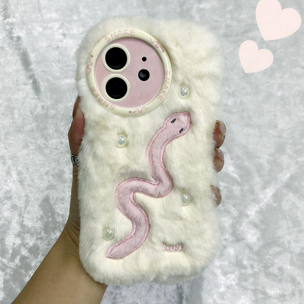 For iPhone 12 Snake Embroidery Plush Silicone Phone Case(Snake And Beige)