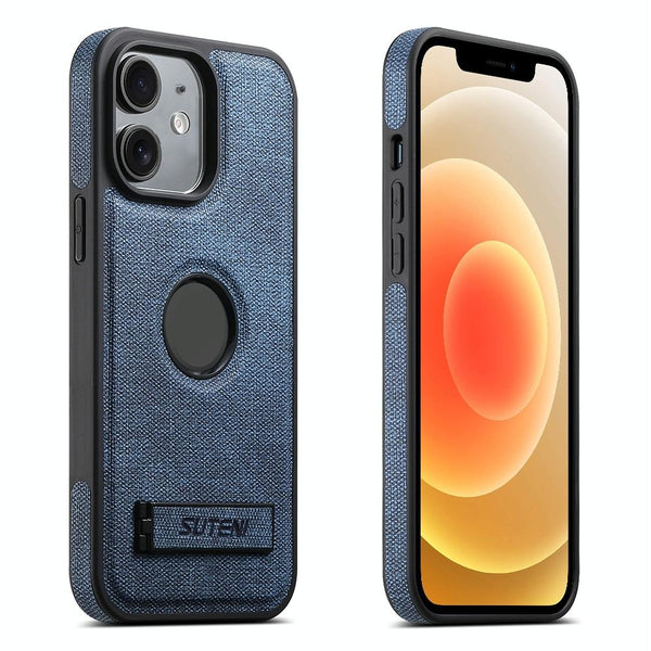 For iPhone 12 Suteni G2 Holder Denim Leather Back MagSafe Phone Case(Blue)