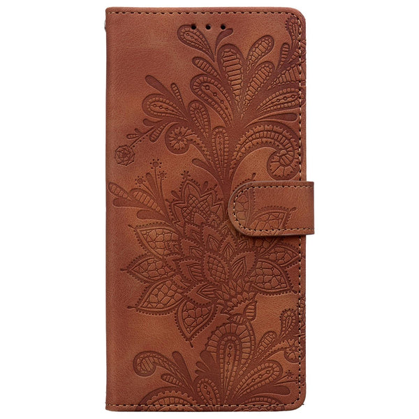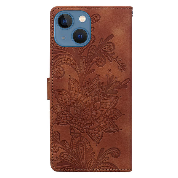 For iPhone 13 / 14 Lace Floral Embossed Magnetic Buckle Leather Phone Case(Brown)