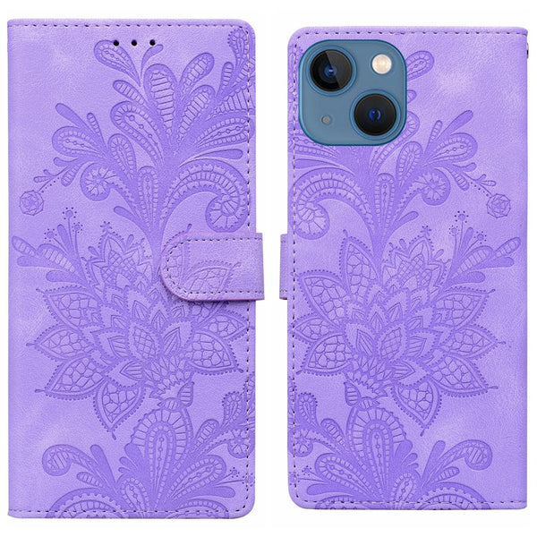 For iPhone 13 / 14 Lace Floral Embossed Magnetic Buckle Leather Phone Case(Purple)