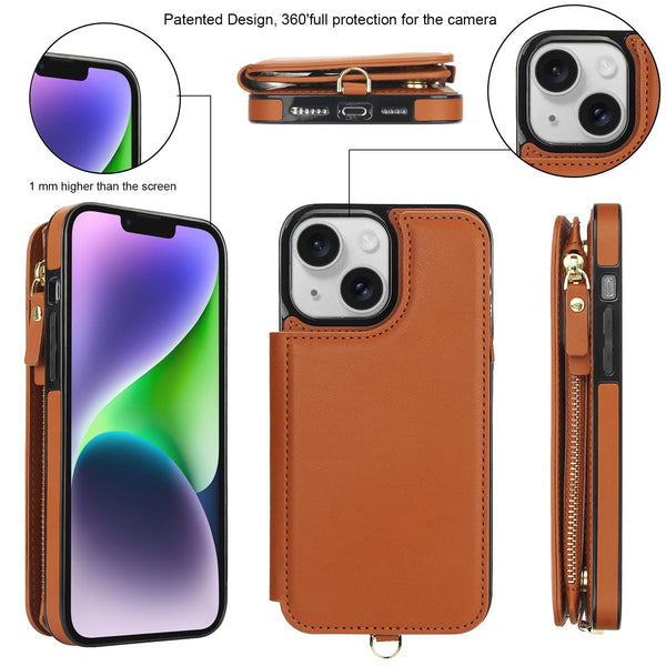 For iPhone 13 Double Flap Zipper RFID Leather Phone Case with Short Lanyard(Brown)