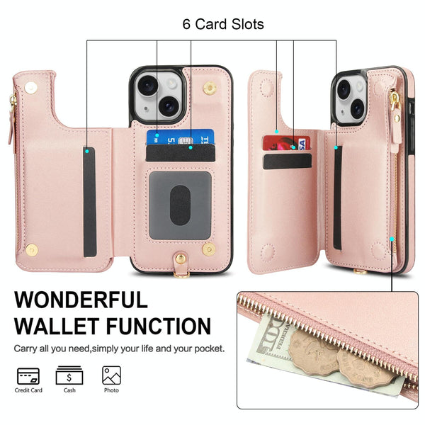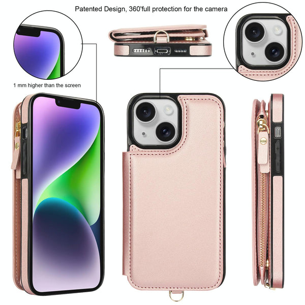 For iPhone 13 Double Flap Zipper RFID Leather Phone Case with Short Lanyard(Rose Gold)