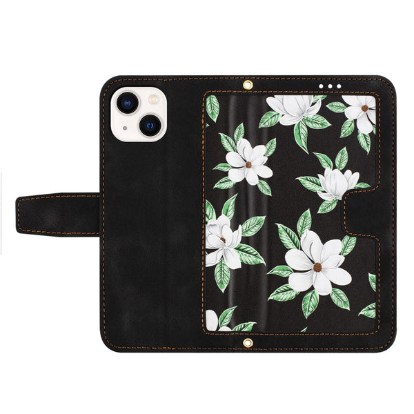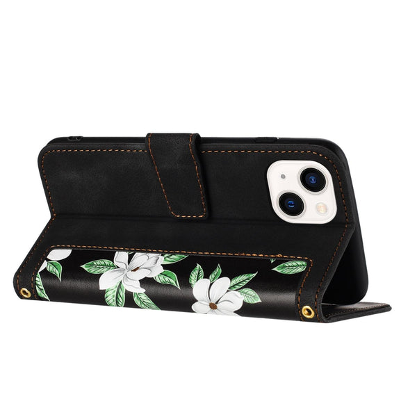 For iPhone 13 Floral Pattern Leather Phone Case with Lanyard(Black)