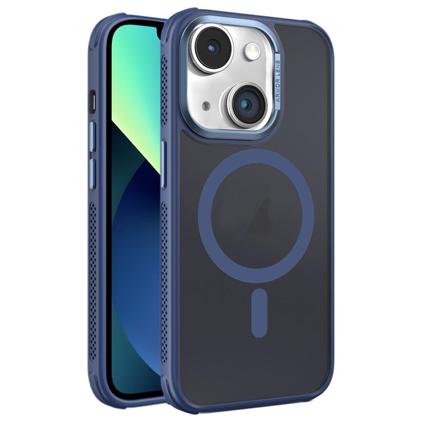 For iPhone 13 Hardware Side Cooling Skin Feel Frosted Metal Lens Frame MagSafe Phone Case(Blue)