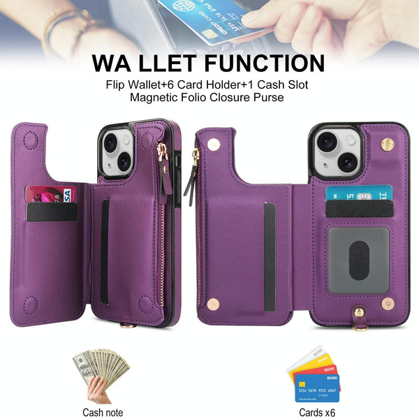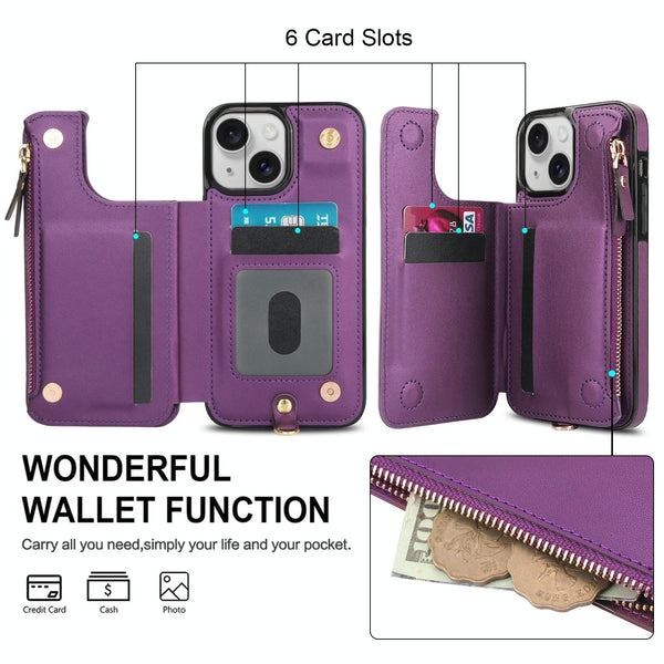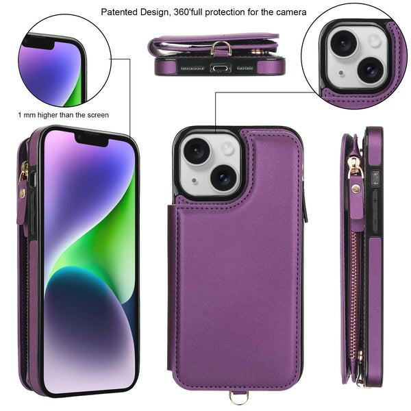 For iPhone 13 mini Double Flap Zipper RFID Leather Phone Case with Short Lanyard(Dark Purple)