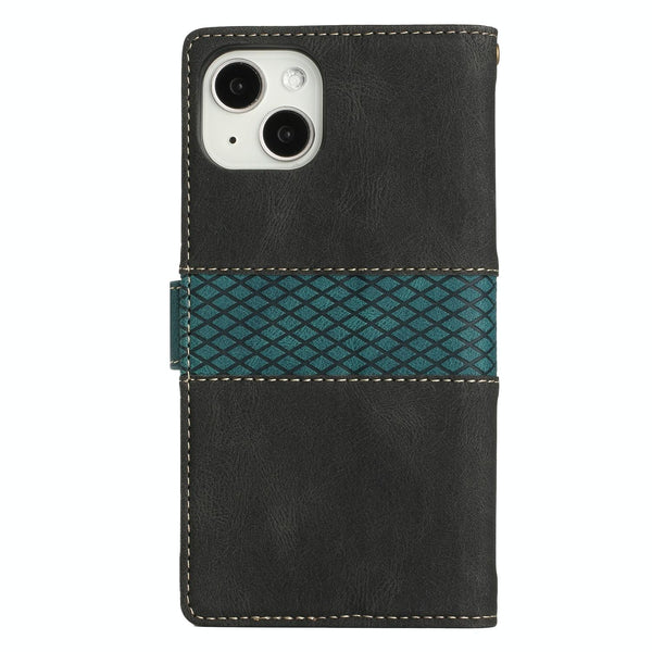 For iPhone 13 mini Grid Stitching Leather Phone Case with Lanyard(Black)