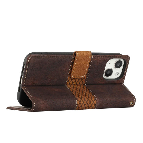For iPhone 13 mini Grid Stitching Leather Phone Case with Lanyard(Brown)