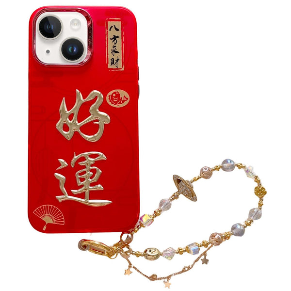 For iPhone 13 New Year Design 3D Gold Stamping IMD Phone Case with Crystal Chain(Good Luck)