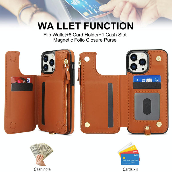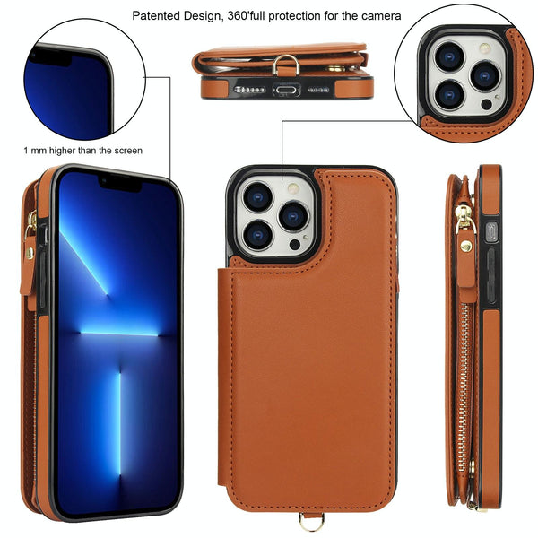 For iPhone 13 Pro Double Flap Zipper RFID Leather Phone Case with Short Lanyard(Brown)