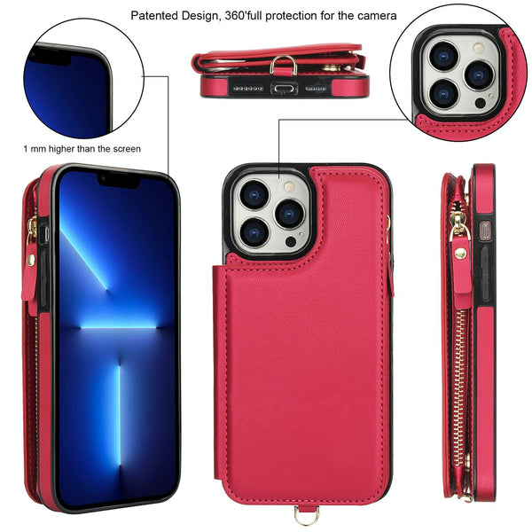For iPhone 13 Pro Max Double Flap Zipper RFID Leather Phone Case with Short Lanyard(Red)
