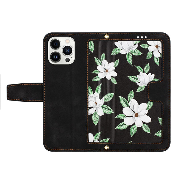 For iPhone 13 Pro Max Floral Pattern Leather Phone Case with Lanyard(Black)