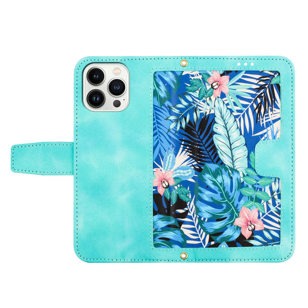 For iPhone 13 Pro Max Floral Pattern Leather Phone Case with Lanyard(Green)