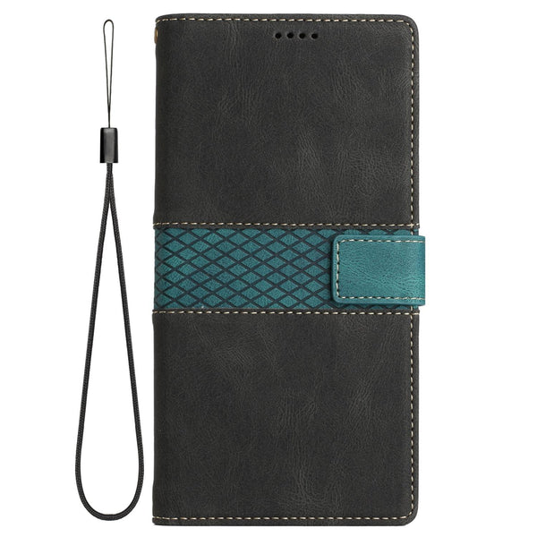 For iPhone 13 Pro Max Grid Stitching Leather Phone Case with Lanyard(Black)
