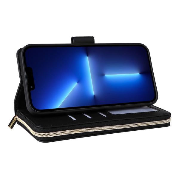For iPhone 13 Pro Max Nine-card Slots Zipper Wallet Bag Leather Phone Case(Black)