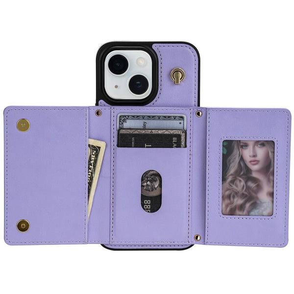 For iPhone 13 Three Fold Card Bag Phone Case with Long Lanyard(Purple)