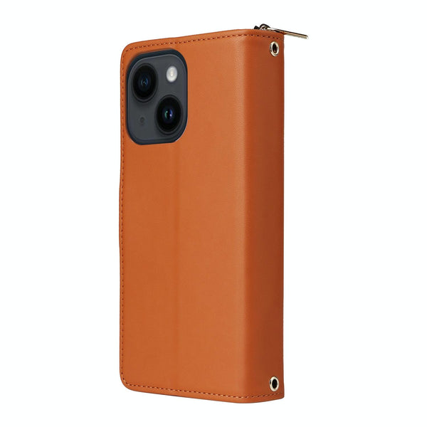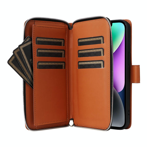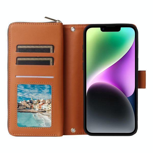 For iPhone 14 / 13 Nine-card Slots Zipper Wallet Bag Leather Phone Case(Brown)