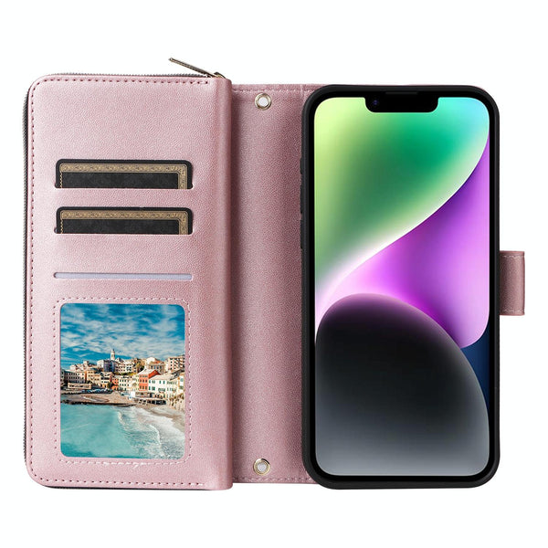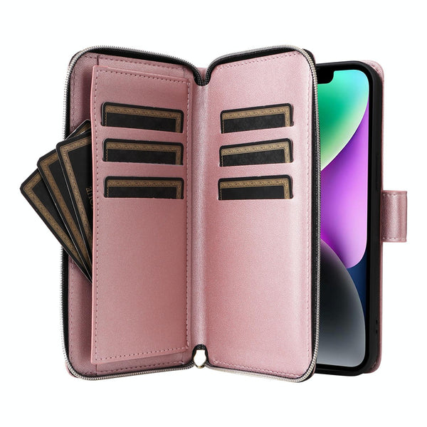 For iPhone 14 / 13 Nine-card Slots Zipper Wallet Bag Leather Phone Case(Rose Gold)