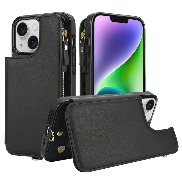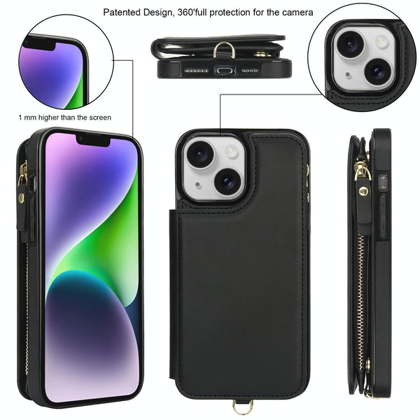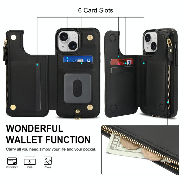 For iPhone 14 Double Flap Zipper RFID Leather Phone Case with Short Lanyard(Black)
