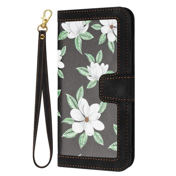 For iPhone 14 Floral Pattern Leather Phone Case with Lanyard(Black)