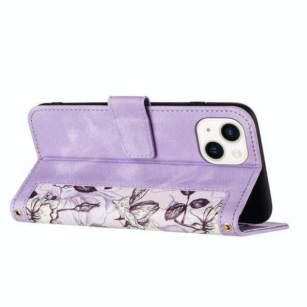 For iPhone 14 Floral Pattern Leather Phone Case with Lanyard(Light Purple)