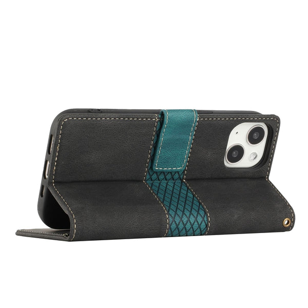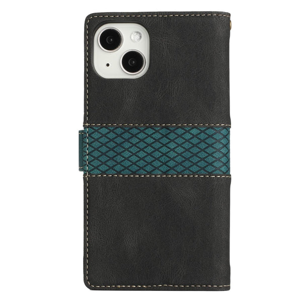 For iPhone 14 Grid Stitching Leather Phone Case with Lanyard(Black)