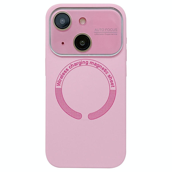 For iPhone 14 Large Window Acrylic Glass Lens MagSafe Silicone Phone Case(Rose Pink)