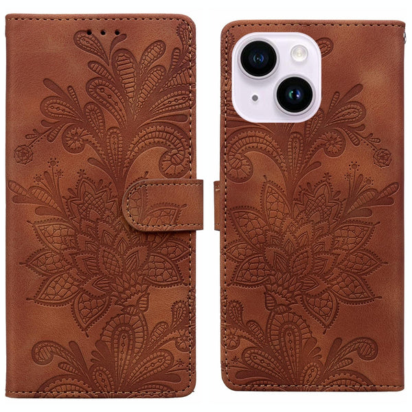 For iPhone 14 Plus / 15 Plus Lace Floral Embossed Magnetic Buckle Leather Phone Case(Brown)