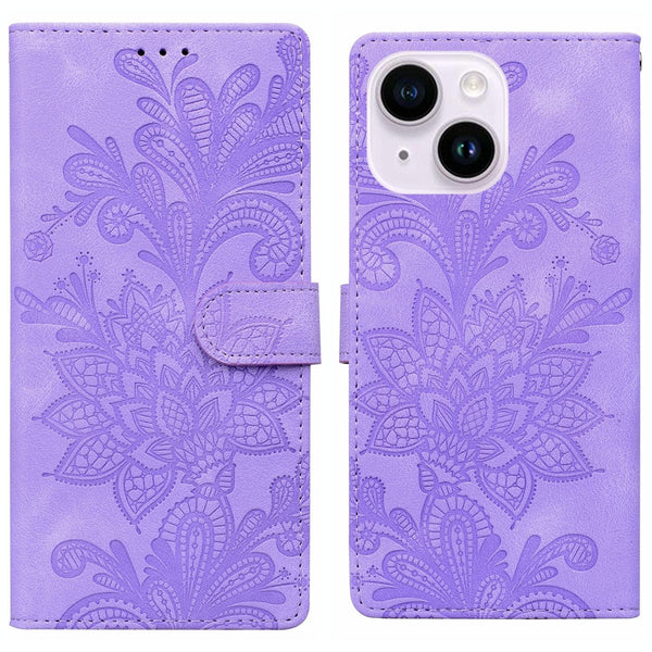 For iPhone 14 Plus / 15 Plus Lace Floral Embossed Magnetic Buckle Leather Phone Case(Purple)