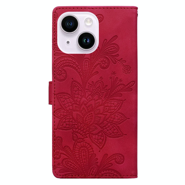 For iPhone 14 Plus / 15 Plus Lace Floral Embossed Magnetic Buckle Leather Phone Case(Red)