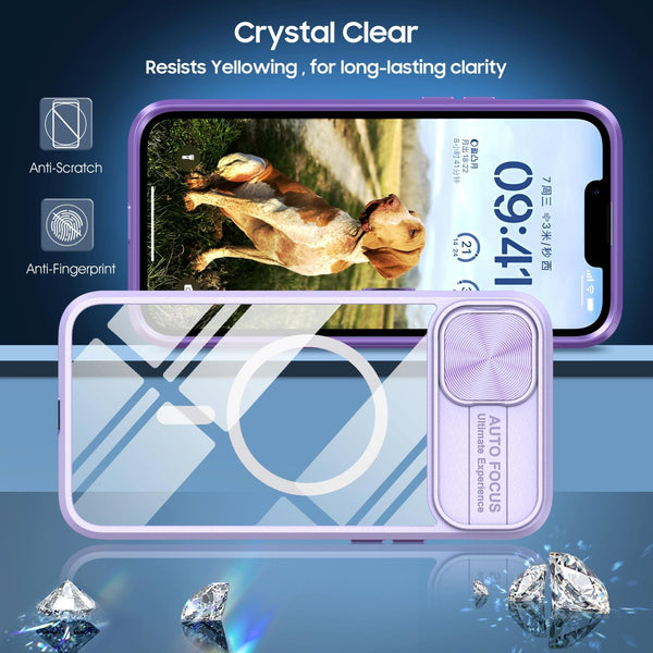 For iPhone 14 Plus Clear Acrylic + PC + TPU MagSafe Lens Sliding Cover Full Coverage Phone Case(Purple)