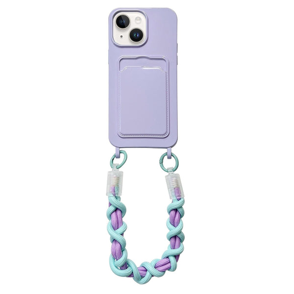 For iPhone 14 Plus Dopamine Card Slot Phone Case with Lanyard(Purple)