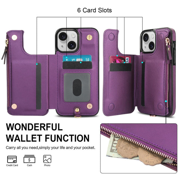 For iPhone 14 Plus Double Flap Zipper RFID Leather Phone Case with Short Lanyard(Dark Purple)