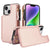 For iPhone 14 Plus Double Flap Zipper RFID Leather Phone Case with Short Lanyard(Rose Gold)