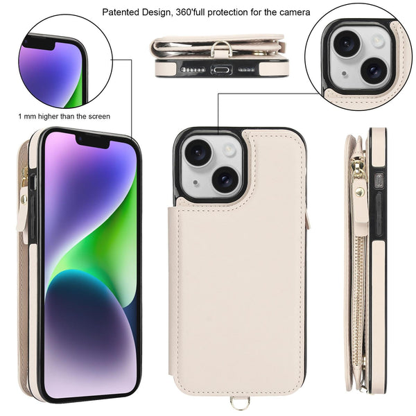 For iPhone 14 Plus Double Flap Zipper RFID Leather Phone Case with Short Lanyard(White)