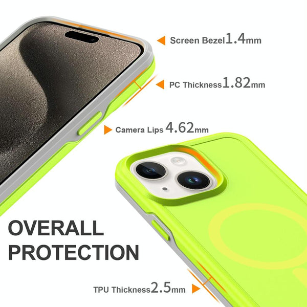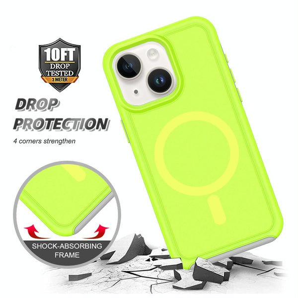 For iPhone 14 Plus Shockproof MagSafe Armor PC Hybrid TPU Phone Case(Fluorescent Green+Gray)