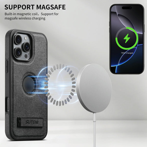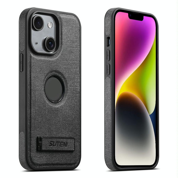 For iPhone 14 Plus Suteni G2 Holder Denim Leather Back MagSafe Phone Case(Black)