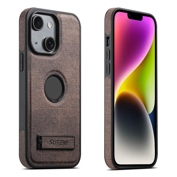 For iPhone 14 Plus Suteni G2 Holder Denim Leather Back MagSafe Phone Case(Brown)