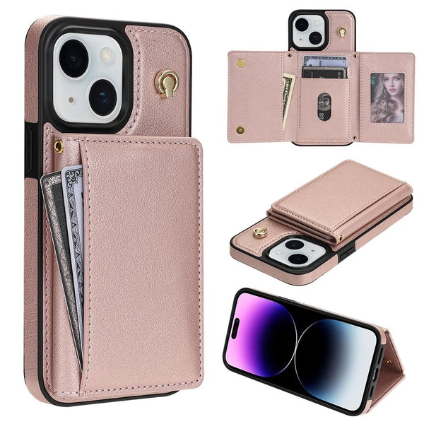 For iPhone 14 Plus Three Fold Card Bag Phone Case with Long Lanyard(Rose Gold)
