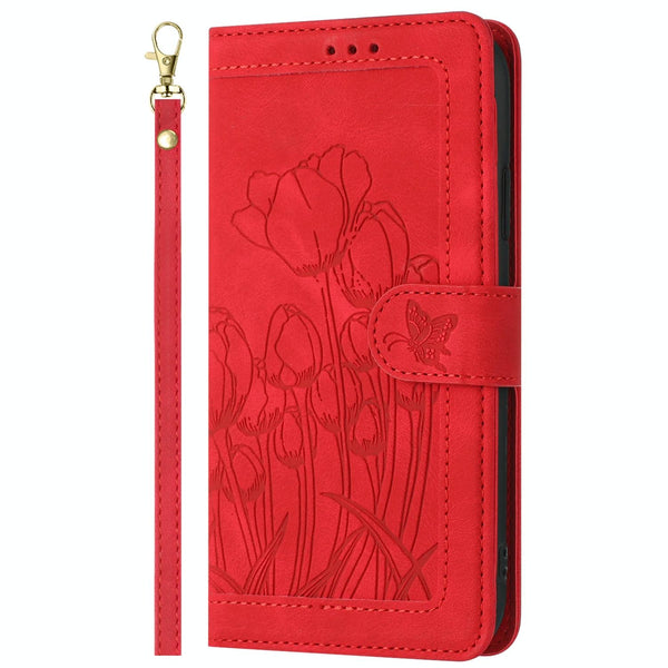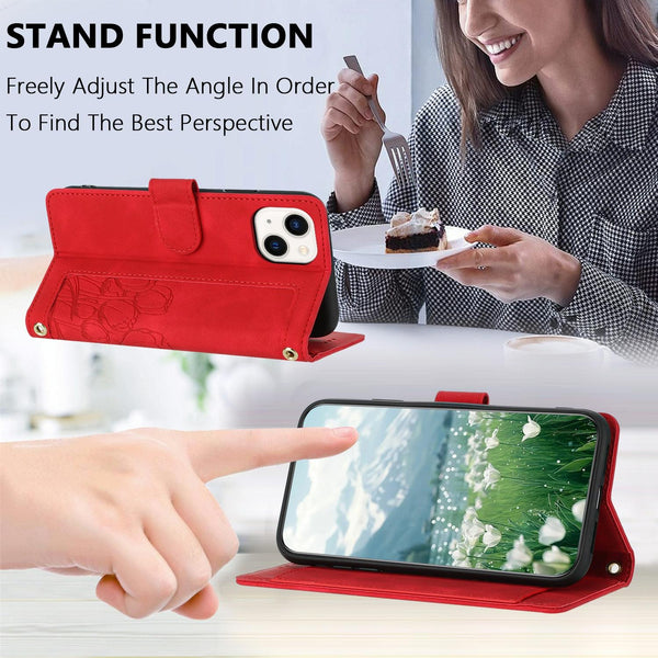 For iPhone 14 Plus Tulips Embossed Leather Phone Case with Lanyard(Red)
