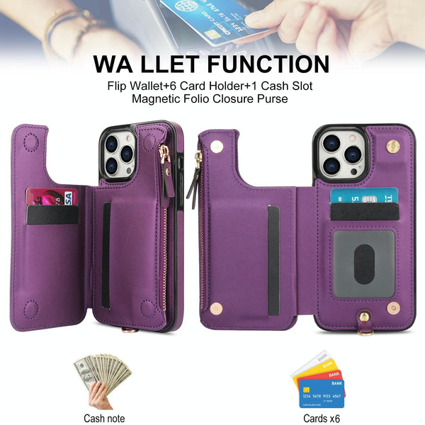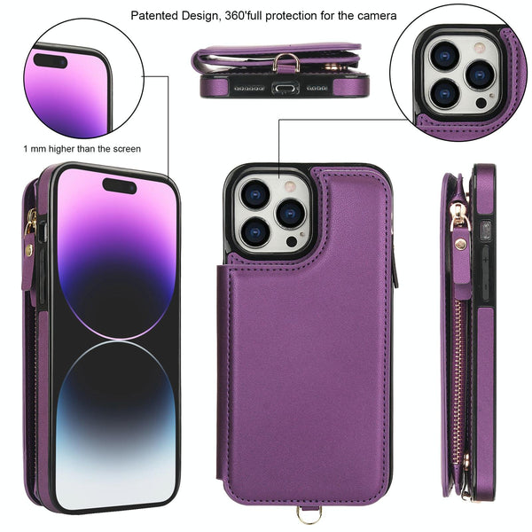 For iPhone 14 Pro Double Flap Zipper RFID Leather Phone Case with Short Lanyard(Dark Purple)