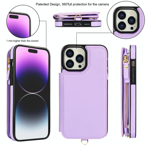 For iPhone 14 Pro Double Flap Zipper RFID Leather Phone Case with Short Lanyard(Light Purple)